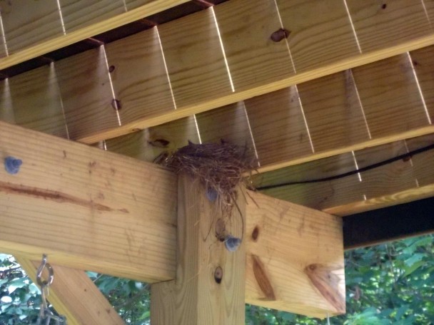 Now it is 2015. And of course the robins return to make a nest. Only this year, they make the nest, and a big ugly disgusting black bird (can you tell I’m a bit mad at this black bird??) comes in and swoops down and looks inside it. Once the black bird’s scent is noticed on the nest, the robins abandon the nest. Of course; so Matt and I take the nest down, and the robins decide to build another one, only on another post under the deck…AND THE BLACK BIRD COMES AGAIN. This time, I think the eggs were laid, the robin had been sitting on the nest for along while. The momma bird goes off for some food, and the black bird swoops in. My heart is broken.